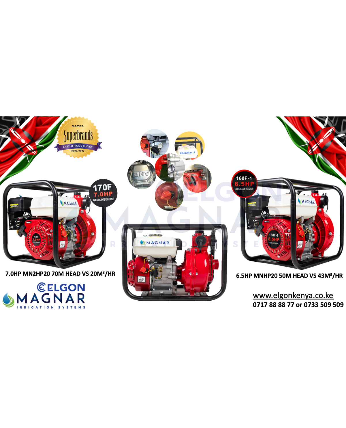 -- MAGNAR brand - Best Quality Water Pump In Kenya - Value For Money - Petrol powered - 70m head - 20 m3/hr - 7Hp engine - Recoil start - Twine impeller - Low oil engine cut off - High efficient - 2" male threaded inlet - Outlet options - 2" x 1 male threaded / 1.5" x 1.5" male threaded / 1" x 1 male threaded